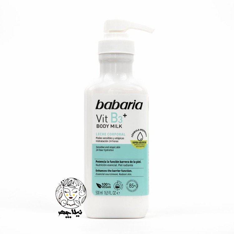 شیر بدن پمپی باباریا babaria حاوی هیالورونیک اسید Hyaluronic Acid مناسب پوست خشک حجم 500 میل