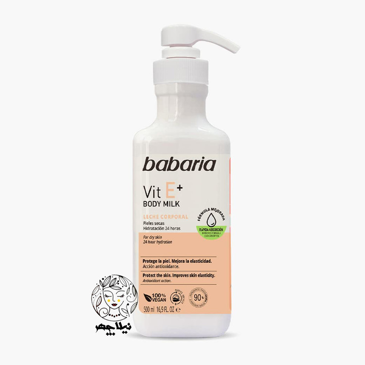 شیر بدن پمپی باباریا babaria حاوی ویتامین E مناسب پوست خشک حجم 500 میل